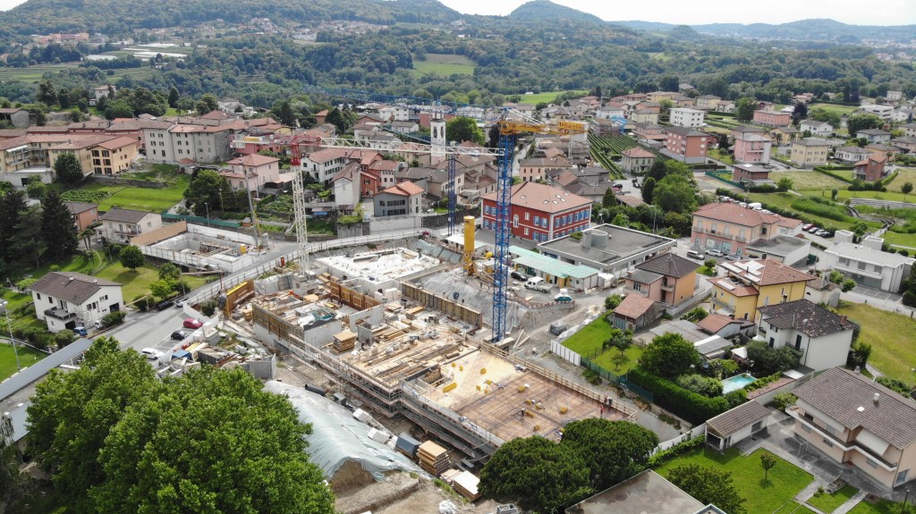 Nell’immagine, l’edificio del Centro Polivalente è la parte in alto a destra. L’altra porzione di struttura sarà la nuova casa anziani, cantiere non gestito da parte nostra.